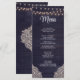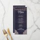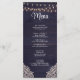Lägg till en touch av rustik charm på ditt bröllopsfirande med vårt Rustik Elegans Meny Kort. Denna vackert designade meny har en mörkblå rustik träbakgrund prydd med ömtåliga strängljus och ett spetsmönster högst upp. Det anpassningsbara menyavsnittet låter dig anpassa den med ditt eget urval av rätter och drycker.