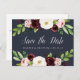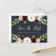 blommigt med elegant vattenfärg spara datumkortsfunktionen "spara datumet" i chicens kalligrafi med namn och bröllop-datum under, accentuerad av översta och grund gräns av vattenfärgblommor i burgundi marsala och rosa med lush grönt löv och löv. Vita bokstäver på en rik marin blå bakgrund tillför chicen bröllop spara datum vykort en dramatisk elegans. Brevkort återförs om du vill visa ytterligare information om hur du sparar datuminformation, inklusive webbplatsen bröllop, med returadress och utrymme för mottagaradressering.