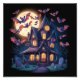 Bilden visar ett styliserat hemsökt hus på natten. Huset är högt med spetsig tak och flera fönster som avger en gult glöd, vilket tyder på insida ljus. Det är många fladdermus som är på flykt mot en mörk himmel. I förgrunden finns det en kyrkogård med gravsten, vilket ökar scenens verkliga atmosfär. Den här bilden är intressant på grund av dess tematiska inslag som ofta förknippas med skräck eller Halloween och dess pulserande ändå mörk färg palett, som ger ett skämtsamt sinnesstämning.