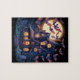 Bilden visar ett styliserat hemsökt hus på natten. Huset är högt med spetsig tak och flera fönster som avger en gult glöd, vilket tyder på insida ljus. Det är många fladdermus som är på flykt mot en mörk himmel. I förgrunden finns det en kyrkogård med gravsten, vilket ökar scenens verkliga atmosfär. Den här bilden är intressant på grund av dess tematiska inslag som ofta förknippas med skräck eller Halloween och dess pulserande ändå mörk färg palett, som ger ett skämtsamt sinnesstämning.