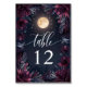 Sätt tonen för din romantiska, himmelska bröllopsmottagning med denna eleganta bröllopsbordnummerdesign "Midnight Garden Moon". Med en lysande fullmåne omgiven av rika burgunderfärgade blommor och mörkt, stämningsfullt lövverk, tillför dessa bordnummer en magisk touch till din kvällsfest. Perfekt för bröllop med ett kosmiskt eller himmelskt tema, säkerställer denna design att din mottagningsdekor är lika förtrollande som natthimlen. Personalisera med dina bordnummer för att guida gästerna till sina platser samtidigt som du håller ditt tema sammanhängande och fängslande.