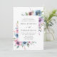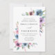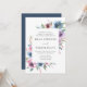 Bröllopbjudanden till blommigten i elegant visar dina bröllop-detaljer som har ramats av en gräns av blommor i lila, mauve och blått med lush grönt löv. Baksidan har en solid mörk blått bakgrund. Designad att samordna med vår Midnight Blooms bröllop-samling.