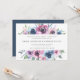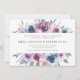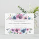 Bröllopbjudanden till blommigten i elegant visar dina bröllop-detaljer som är ramade av en överkant och grund gräns av blommor med lila, mauve och blått vattenfärg med löv av lush grönt. Baksidan har en solid mörk blått bakgrund. Designad att samordna med vår Midnight Blooms bröllop-samling.