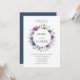 Bröllopappningar med elegant blommigt som visar namn inringade av en ram med en överkant och grund gräns av lila, mauve och blå vattenfärgblommor med lush grönt löv. Anpassa inbjudningarna till lila och blå blommigt genom att lägga till bröllop-informationen nedan. Baksidan har en solid mörk blått bakgrund. Designad att samordna med vår Midnight Blooms bröllop-samling.