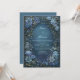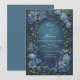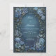 Fördupa dina gäster i en värld av midnatts elegans med denna hisnande stämningsfulla botaniska komposition. Designen har en djup, dyster marinblå bakgrund med en målerisk textur som ger en rik grund för den skimrande blomgränsen. Stora, stjärnformade klematisblomblad i nyanser av dammig blå och teal förankrar hörnen, medan ömtåliga sprayer av små periwinkle-blomkluster och bronsade bladmotiv strömmar elegant längs kanterna. En klassisk förgylld ram med dubbla linjer ger en touch av kunglig sofistikation till den utsmyckade layouten. Denna bröllopsinbjudan är ett förstahandsval för en formell kvällsceremoni, en vintergala eller ett dystert viktorianskinspirerat evenemang