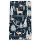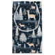 A lush winter landscape with tan colored deer roaming amongst deep blue fields of falling snow covered with pine trees and village houses.