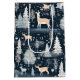 A lush winter landscape with tan colored deer roaming amongst deep blue fields of falling snow covered with pine trees and village houses.