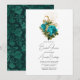 Turkos - teal och guld shabby-chic akvarell rosor bröllopsinbjudan med damaskus mönster på baksidan.