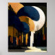 Solfjäderformade tak i djupblått, guld och mjuk beige reser sig som lysande kronor ovanför en geometrisk stadsbild och förenar natur och arkitektur till en enda surrealistisk vision. En lysande himlakropp sprider ljus över scenen, medan en slingrande lysande stig leder blicken genom höga stammar och strukturerade block. Konsten balanserar organiska strålande linjer med djärva urbana former och skapar en drömlik sammansmältning av skog och siluett. Designad i ett flexibelt format med 4:5 proportion, denna högupplösta digitala nedladdning tillför lysande konstnärskap och hantverksskicklighet till valfritt utrymme, perfekt för inramning, som present eller för att förhöja din heminredning med levande trädg