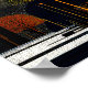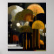Midnight Canopies: En himmelsk abstrakt skog. Cirkulära och halvcirkulära trädtopp i guld, orange, marinblått och djupbrunt reser sig mot en mörk, stjärnbeströdd himmel, varje trädtopp fylld med invecklad förgreningsmönster som lyser som upplysta stjärnbilder. Stora månlika klot och geometriska arkitektoniska former väver sig genom scenen och blandar natur med surrealistisk struktur. Konsten skapar en rikligt texturerad, drömliknande skog som känns både kosmisk och modern. Utformad i ett flexibelt format med 4:5 proportion, ger denna högupplösta digitala nedladdning lysande konstnärskap och hantverksskicklighet till valfritt utrymme, perfekt för inramning,
