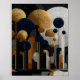 Månskenets prakt: En geometrisk skog i blått och guld. Rundade trädkronor i guld, orange och djupblått reser sig som lysande lyktor under en vidsträckt vit måne, och deras smala stammar skapar ett rytmiskt vertikalt flöde tvärs över scenen. Invecklade texturer och geometriska markmönster blandar naturliga former med modern abstraktion, vilket ger skogen en drömlik, nattlig atmosfär. Kontrasten mellan de lysande trädkronorna och den mörka, stjärnbeströdda himlen tillför djup och tyst drama till detta surrealistiska landskap. Utformat i ett flexibelt format med 4:5 proportion, ger denna högupplösta digitala nedladdning lysande konstnärskap och hantverksskicklighet till