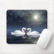 Svanar med huvudena och nacke som bildar en kärleksfull hjärtform i ett vackert måne och stjärnljus romantisk musmatta lämplig för bröllop på kvällen, årsdagar, Alla hjärtans dag eller något annat kärleksfullt tillfälle