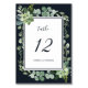 Det här bordsnumret i bröllop har färgade vattenfärgssukulenta löv, eukalyptus och botaniska gröntar med en rektangel ram på en blå bakgrund i midnattsflottan. Matchande objekt är också tillgängliga.