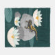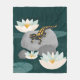 A detailed and naturalistic flat-style illustration of a fire salamander — rendered in dramatic black with vivid yellow spots — crawling across smooth grey rocks, surrounded by elegant white water lilies in a deep teal pond. The high contrast between the salamander's markings and the soft background creates a striking visual. This art piece appeals to nature enthusiasts and collectors of unique botanical and wildlife art.