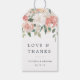 Lägg dessa märkre om blommigt i eleganten på dina bröllopsfavoriter för att tacka gästerna i chic stil. Vita märkre har en bukett av peonier och ro i rosa, persikor och elfenben, med sage grönt foliage. "Kärlek och tack" visas under er namn och bröllop. All text är redigerbar för den slutliga anpassningen.