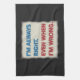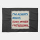 Svart kökshandduk som alltid rätt presenterar design med texten "mig förmiddag. Även om I-förmiddagfel" i blått och rött.