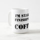 " Mig bli för förmiddag. Avsluta mitt kaffe.", i svart text på en vitmugg.