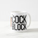 Ett mugg med Mighty Cockblock-design och ursprunglig karaktär av Stitcheart Artworks.