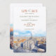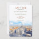 Denna fängslande save-the-date-kort har en fantastisk akvarellskildring av Duomo di Milano och den omgivande stadsbilden, badad i den varma glöden från en solnedgång. Konsten visar upp livliga nyanser av eldig orange, djupröd och kontrasterande svala blåtoner, vilket skapar en hisnande representation av Milanos siluett. De rika färgerna och fina detaljerna ger ett romantiskt och konstnärligt touch, perfekt för en destinationbröllop i Italien.