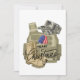 Utformningen illustrerar en militärväst, stövlar, hatt och hundbrickor med amerikansk Flagga, Black "God jul" text Typography är i mitten av prydnadsföremål. På baksidan finns önskemål och ett alternativ för att lägga till ett eget foto, skapar det extra speciellt för helgdagarna! Kontakta mig för ytterligare ändringar. Tack för att du besökte vår butik! Copyright Soar i Stil Designer LLC.