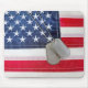 Hundbrickorna vilar på en del av den amerikanska flagga och visar stars och stripes i detalj. Märkrna i metall står i kontrast till väven, symboliserar militärtjänst och patriotism.