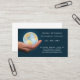 Professionell visitkort med en hand som erbjuder en upplyst glob på en mörkblå bakgrund.