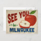 Ett charmerande vykort från Milwaukee Wisconsin vintage resor med ett underbart rött äpple, tillsammans med texten från roligt retro stil där det står: "Vi ses i Milwaukee"