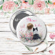 Girl's pink and sage green baby and puppy dog Mimi To Be button. Sweet baby girl sitting next to her little black and white Mini Aussie puppy dog in a patch of pretty watercolor flowers. Pink and sage green butterfly and pretty wildflowers.