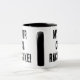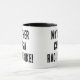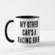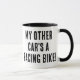 Visa dem att du är en cyklande fläkt. Kaffet mugg har sloganen "Min andra bil är en Tävla Bike!". Svart Lettering på en vit bakgrund.