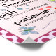 "Det här är min bön för dig: "Komfort på svåra dagar, leende när sorgen inkräktar, regnbåge för att följa molnen, skratt för att kyssa läppar, solnedgångar för att värma ditt hjärta, kramper när spriten sjunker, skönhet för ögon att se, vänskaper för att öka din varelse, tro så att du kan tro, förtroende för när du tvivlar, mod att känna dig själv, tålamod att acceptera sanningen. Kärlek för att slutföra ditt liv." Med rosa / ro / lila och en polka punkt gräns.