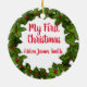 Min första julGe träd mycket mer helgdag med en anpassningsbar keramisk prydnad. Lägg till familjefoton, bilder eller personliga meddelanden på båda sidor av julgransprydnaden. En kniv av guld-tråd gör det enkelt att hänga upp denna fantastiska keepsaké.