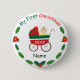En baby i baby barnvagn i rött och grönt och dekorationer med "Min första jul". Kort och unik julklapp till spädbarn för att minnas din baby första jul.