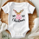 Min första julklapp Reindeer Flicka Baby-dräkt innehåller texten "Min första jul" i modern manustypografi som accentueras av en söt renare som bär en rosa scarf och dekorationer i sina tändare. Perfekt julklapp till flicka. Skapat av Evco Studio www.zazzle.com/store/evcostudio