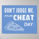 Du borde känna dig fri att äta skräpmaten du vill då och då efter allt det träningen och dieten utan någon dömande blick från andra. Denna design uttalar precis det med sin humoristiska text som lyder "Döm mig inte. Det är min fuskdag." och en skiva pizza med pepparoni på och ost som rinner av på sidan för att illustrera idén.