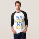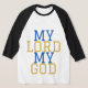 Den här 3/4-sleevens t-shirt-visningen ord "Min Herre gud" i ett fet stil med blått och gyllene färgad brev i ett typograftema stil och ett trosbaserat tema. Den här skjortan har en vit- eller askkropp med passande sleever och hylsa med dubbla-nål sydda grund och sleeve-blödningar under lång hållbarhet.