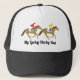 Ta med dig lite tur vid nästa tävla av hästen Derby Dag, med denna roligt. Den innehåller två jockeys som rider på tävling hästar, med texten under läsningen av MY LUCKY DERBY HAT. Texten är anpassade om du föredrar att ändra den till ett namn eller ett annat meddelande