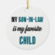 Den fina julprydnadsdesignen för dina lagrar! Gör en underbar Mors dag-gag-gåva eller Fars dag gag-gåva. Uttrycket "Min svärson är mitt favoritbarn". Du kommer att få ut lite skratt av dina lagar.
