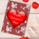 Vi presenterar vår exquisite, "My Heart Beats for You" Valentinkortet, ett strålande uttryck för kärlek och tillgivenhet som sträcker sig bortom ord. Detta vackert utformade kort är designat för att fånga hjärtat, skapar det som perfekten för att förmedla ditt djupaste känslor denna speciella dag. Kortets framsida har ett häpnadsväckande, stort hjärta med röda gel som omedelbart fångar öga. "Glad Alla hjärtans dag" är elegant skriven över hjärtat och ser till att ditt budskap om kärlek går fram och tillbaka. Rikens röda nyans tillför värme och passion till kortet och anger tonen för ett romantiskt firande. Under hjärtat växer en känslig vit snöre mönster i ro upp, vilket ger en aning tidlös elegans. Varje invecklad detalj är genomtänkt och skapar ett synligt mästerverk som symboliserar skönheten i ditt förhållande. Motivet från snöre fungerar som en poetisk bakgrund som förstärker kortets totala karm. Inuti kortet finns det gott om utrymme för att kunna rita upp ett eget hjärtligt meddelande på den lämnat sidan av det öppna kortet. På högerna finns roligten "Mitt hjärta (kärlek) slår för dig". Allt kan vara personlig om du hellre vill ändra det till ditt unika budskap om kärlek. Oavsett om du firar ett nytt romantik eller omhuldar år av delade minnen är detta Valentinkort en tidlös gest som talar sitt tydliga språk.