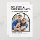 Mina människor Gifta sig Spara datumkortet för par som är hundägare. Ägare till roligt 2-Foto Spara datumkortet låt oss att du har två foton av paret lycklig och deras älskade husdjur. Arch form med svart gräns ramar är ett foto av paret med deras hund och på baksidan en annan bågfoto av det förlovade paret och deras vackra valp.