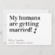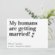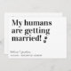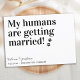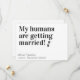 Mina människor är Gifta sig! Låt er bästa Hund tillkännage ert bröllop med denna moderna och enkla "Mina människor är Gifta sig"-hund spara datumkorten. Anpassa med namn, datum och bröllop. Detta tillkännagivande i bröllop spara datum kommer att bli ett slå med er familj och era vänner. COPYRIGHT © 2020 Judy Burrows, Black Hund Art - Med alla Höger reserverade. Mina människor Gifta sig Hund Bröllop spara datum