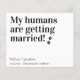 Mina människor är Gifta sig! Låt er bästa Hund tillkännage ert bröllop med denna moderna och enkla "Mina människor är Gifta sig"-hund spara datumkorten. Dessa inbjudningar till budgetbröllop omfattar inte kuvert. Se vår samling för matchning av A6-kuvert, eller vårt vykort. Anpassa till namn, datum och bröllop. Detta tillkännagivande i bröllop spara datum kommer att bli ett slå med er familj och era vänner. COPYRIGHT © 2020 Judy Burrows, Black Hund Art - Med alla Höger reserverade. Mina människor Gifta sig Hund Spara datumkort