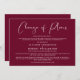 Om omständigheter som social distansering kräver att du minskar antalet på ditt bröllop kan du informera familj och vänner på din ursprungliga utökade gästlista med detta moderna och minimala, men ändå eleganta, burgunderröda mindre nedskalade bröllopsmeddelande. "Ändrade planer" är skrivet med ett fint vitt skrivstil och du kan enkelt anpassa meddelandet om nedskalning av bröllopet i mer detalj och lägga till information om livesändning av ceremonin, kommande firanden och bröllopswebbplats.