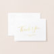 Ett typografiskt bröllop-kort i chic är ett tack för dig i guld. Med frasen "Tack" i handskrivet teckensnitt och datum för namn och bröllop. Kortet är tomt för ditt eget handskrivna meddelande.
