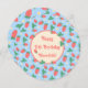Ett sött födelsedagskort som har ett förtjusande och lekfullt mönster av spridda mini-jordgubbar mot en mjuk, himmelblå bakgrund. Jordgubbarna är avbildade i en livfull röd färg med gröna blad, och de är utspridda med små, ömtåliga vita eller ljust gula jordgubbsblommor, vilket ökar charmfaktorn. Det övergripande intrycket är glatt, fräscht och sött, vilket gör det perfekt för barn.