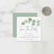 MINI STORLEK 2,5-tumsruta OBSERVERA om du är i USA, 2,5-tumskvadraten är mindre än USA:s minsta portokrav så välj storlek 5,25 x 5,25-tumsruta om du tänker skicka dem (Observera också att kvadratiska kort kan kosta mer för post än rektangulära kort). En snyggt ställer in typografi i svart för Spara datum som kompletterar resten av texten som du enkelt kan anpassa, med en gren av elegant vattenfärgseukalyptus löv ovan. På baksidan finns en samordnande skugga av grönt som kan ändras till ett annat färg om du vill via alternativet Anpassa ytterligare.