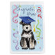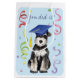 Gratulera din favorit- student med en gåva i en hänga lös som lite presenterar en gullig miniatyrSchnauzerstudent som ha på sig en mortarboard amid en kastby av konfettiar.