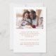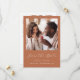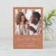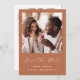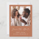 Det här enkla, minimalistiska Spara datumkortet innehåller ett fyrkantigt foto ovanför orden "Spara datum" i ett vitt handskriftsskript i elegant, följt av parets namn, bröllop datum och stad i sans serif-teckensnitt på en terracotta-bakgrund. Lägg till ett andra foto med vågrät och ett mer detaljerat meddelande med ytterligare information om det omvända.