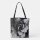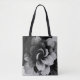 A modern tote bag featuring a minimalist abstract floral design in black and white.