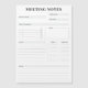 En minsta svartvit anteckningsplanerare för möten på hemmet eller på arbetsplatsen. Har plats för ett projektnamn, datum, ämnen att diskutera, en lista att göra med ansvariga personer och tidsfrister och plats för dina anteckningar.