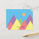 minimal bergskonst, enkelt Mcm-vykort i mitten av århundradet stil, med enkla utskurna former i lila rosa gult på blå himmel med orange sol ljusa färger textteckensnitt enkelt. Du kan överföra denna DESIGN på andra Zazzle-produkter och justera den så att den passar de flesta av Zazzle-objekten.